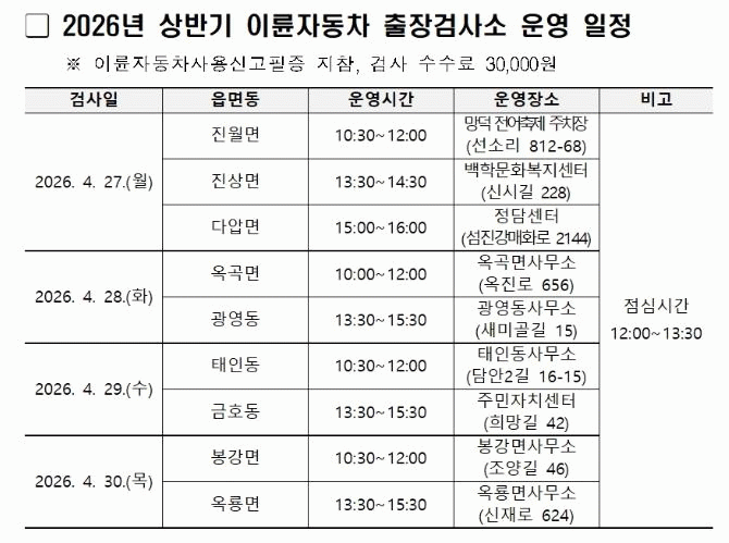 이번 출장검사 대상은 검사 유효기간 만료일이 2026년 3월 27일부터 5월 31일 사이인 50㏄ 이상 260㏄ 이하 중·소형 이륜자동차다.