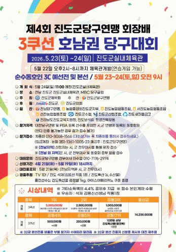 이번 대회는 대한당구연맹이 주최하고 전남당구연맹과 진도군당구연맹이 공동 주관하는 전국 규모의 대회로, 프로선수들이 참가해 수준 높은 경기를 펼칠 예정이다.