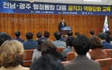 제갈대종 기자2026.03.09 14:11[호남미디어협의회]전라남도와 광주광역시의 행정통합이 법제화되며 ‘호남권 메가시티’ 실현이 가시화되는 가운데, 목포시가 통합 이후 지역의 미래 청사진을 마련하기 위한 선제적 대응에 나섰다. 시는 지난 9일 시청 회의실에서 전 직원을 대상으로 '전남·광주 행정통합 대응 공직자 역량강화 교육'을 실시했다. 이번 교육은 지난 3월 5일 국회 의결을 거쳐 공포된 '전남광주통합특별시 설치를 위한 특별법'에 따라 오는 7월 통합특별시 출범을 목표로 추진되고 있는 행정통합에 체계적으로 대비하기 위해 마련됐다. 이날 교육은 전남연구원 김대성 상...